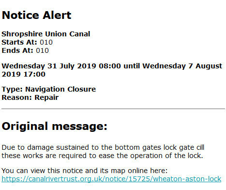 Later in the year, there was a serious leakage in the cill at Wheaton Aston lock on the Shropshire Union Canal. Canal and River Trust have announced a week's closure to fix it starting on 31July. This is exactly the period when the maximum number of navigators wish to use the canal, and there are a dozen days between the announcement and the closure, to accommodate, so says the notice says two weekends of boats heading for a festival. We have to wonder how the temporary repairs can extend into the beginning of the school holiday peak usage, but not the end. We ought to have additional information and reassurance that this is wholly unavoidable, and something more than a convenience for C&RT and their contractors.