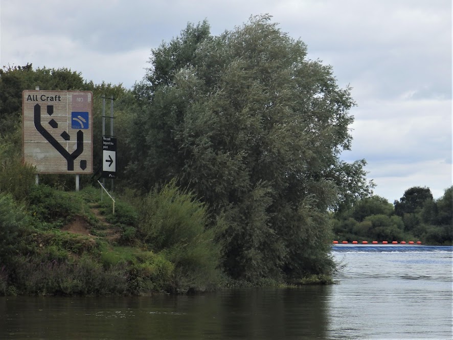 Less dangerous is the sign for upriver traffic at Upper Lode. The main sign accurately shows the way to the lock, but it has another newer, less faded sign alongside, with a prominent arrow pointing towards the weir, with the small words "No Craft Beyond This Point". You couldn't make it up.