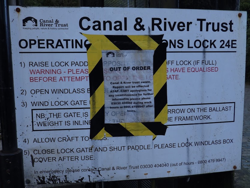 Through the tunnel we have the declared stoppage at the guillotine lock 24E at Slaithwaite: "Bookings are available on the hour, ... 9am to 2pm with at least 24 hours’ notice". Well, in practice, the people at Marsden Tunnel Entrance said it's much more flexible than that, but trip planners reading the website don't know that, and there's the risk they will find it all looks too hard to begin the journey. This gate has caused stoppages on two of our earlier trips, and needs to work better.
