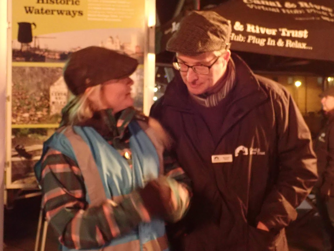 Unfortunately, the pumps had not worked correctly at the right time and there was too much mud. Never mind, the amphitheatre at the entrance to Leeds Dock made a very good substitute. To put us back to the time of the navvies, the audience were issued with a cap and two pieces of string. The string was to tie round our trousers just beneath the knee to keep out the rats! We were then treated to an audio visual experience telling the story of waterways concentrating on the local rivers and canals. The atmosphere was enhanced by large flares and the experience completed by cups of hot cider and cakes. Elaine Scott |