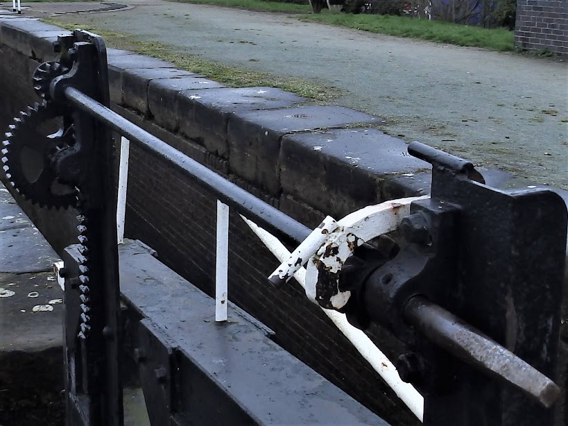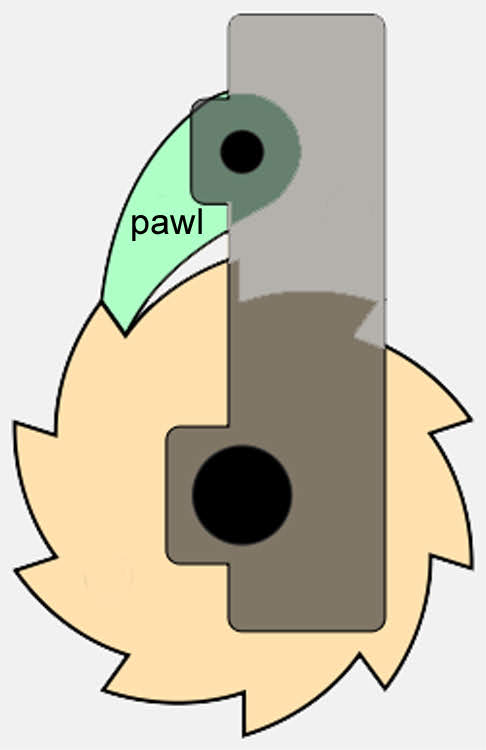 | Think of winding up a groundpaddle or gatepaddle on a Midlands narrow lock or wide lock. To hear that satisfying clicking noise, a ratchet mechanism needs to be clicking on the paddle gearing, and preventing the paddle dropping if you let go of the windlass. That's the pawl. Mostly you have to flick it on to the gear before you start winding, and flick it off again before the paddle can be lowered. |