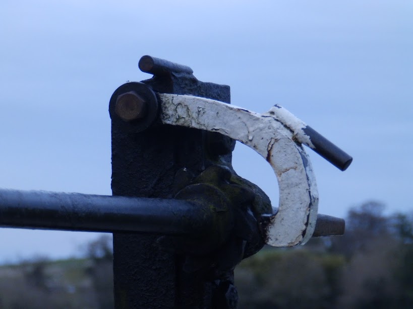 At Atherstone flight, and elsewhere, CRT have been installing new pawl STOPS, small bars of metal that prevent the pawl being flicked all the way off: the idea is that the pawl is always on the gear ready for the next winding-up. But to wind-down you need one hand to hold the pawl the inch away from the gearing that is now allowed, and take the weight of the paddle with the windlass with the other hand. |